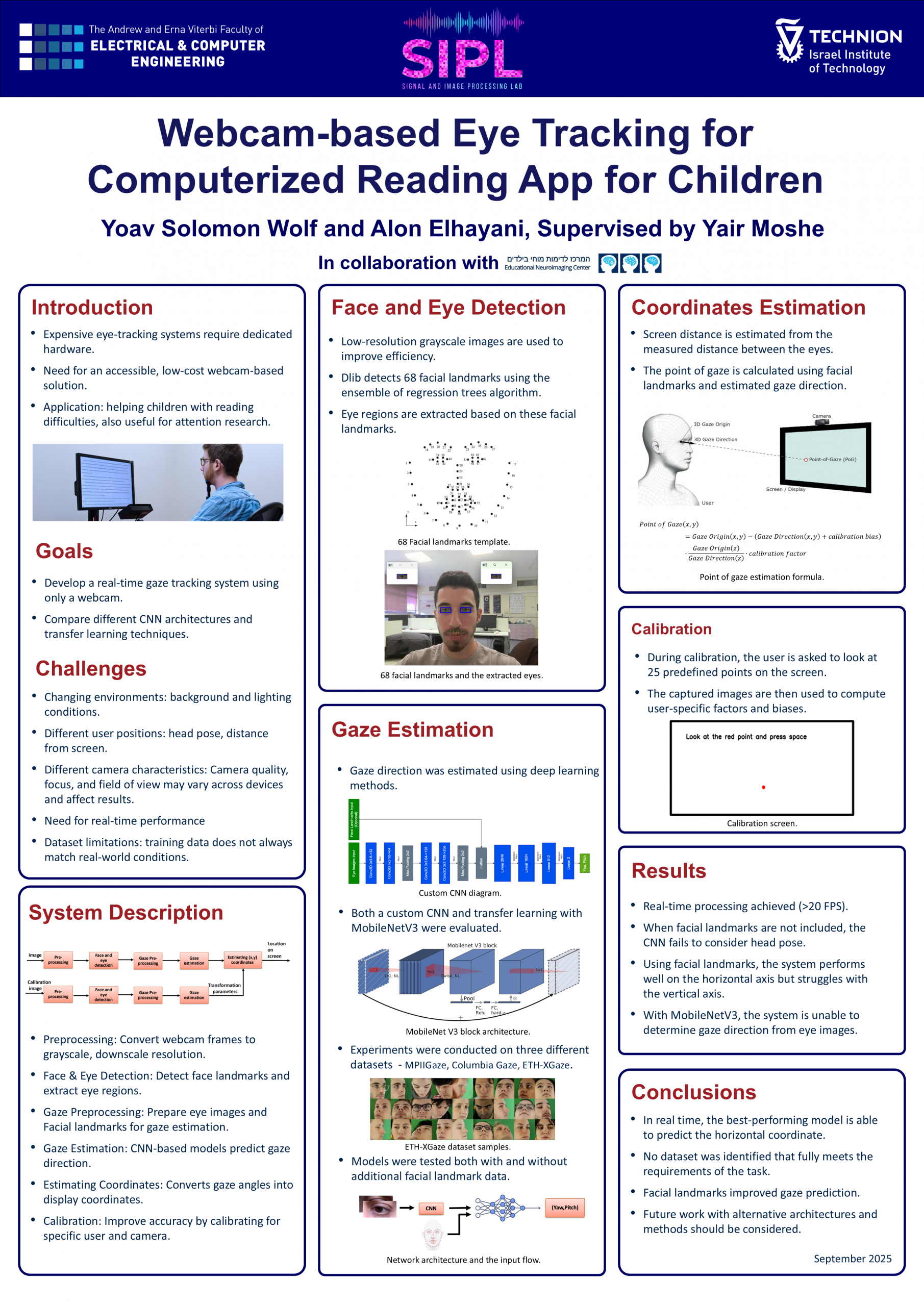 Project DetailsAdvanced eye-tracking systems are expensive and require dedicated hardware, making them inaccessible for everyday use despite their considerable potential for attention research and for educating children with learning disabilities. The aim of this project is to develop an accessible, simple, and low-cost system based on a standard webcam, capable of real-time gaze estimation on a computer screen, operating in a non-specialized setting. The primary emphasis is on creating a tool that helps improve children’s reading skills and can be used in therapeutic and educational contexts. The system we developed builds on insights from previous projects that used Convolutional Neural Networks (CNNs) and facial landmark detection to estimate gaze direction. In this project, we focused on comparing different CNN architectures and explored transfer learning techniques using several specialized datasets. We found that combining facial-landmark data with images of the eye region enables gaze prediction along the horizontal axis, whereas predicting gaze along the vertical axis remains challenging. In addition, we compared different architectures in terms of both runtime and prediction accuracy.