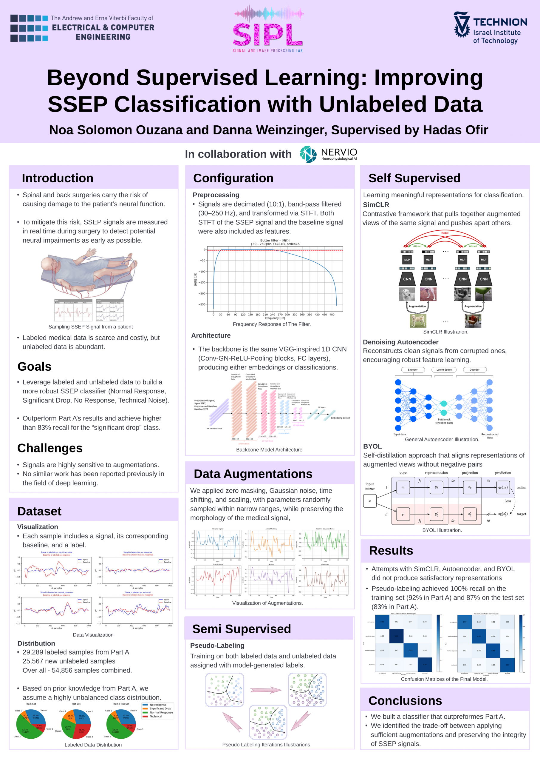 Project DetailsSpinal and back surgeries carry the risk of impairing the patient’s neural function. To reduce this risk, neurosurgeons monitor SSEP signals in real time. These signals are complex medical data that require expert labeling, a resource-intensive process that leaves us with both labeled and many unlabeled examples. In part A of the project, we used only the labeled data to build an SSEP classifier using fully supervised learning. The goal of this follow-up project is to develop a deep learning and signal processing system that also leverages the unlabeled data, aiming to surpass the performance of the initial model. Based on the architecture and preprocessing pipeline of part A, we explored various unsupervised and self-supervised approaches. Attempts to extract meaningful representations and train classifiers on top of them failed, mainly due to the sensitivity of the signals to augmentations and due to the high similarity between classes. In contrast, the pseudo-labeling approach proved effective, yielding a stable and reliable classifier that outperformed the original model.